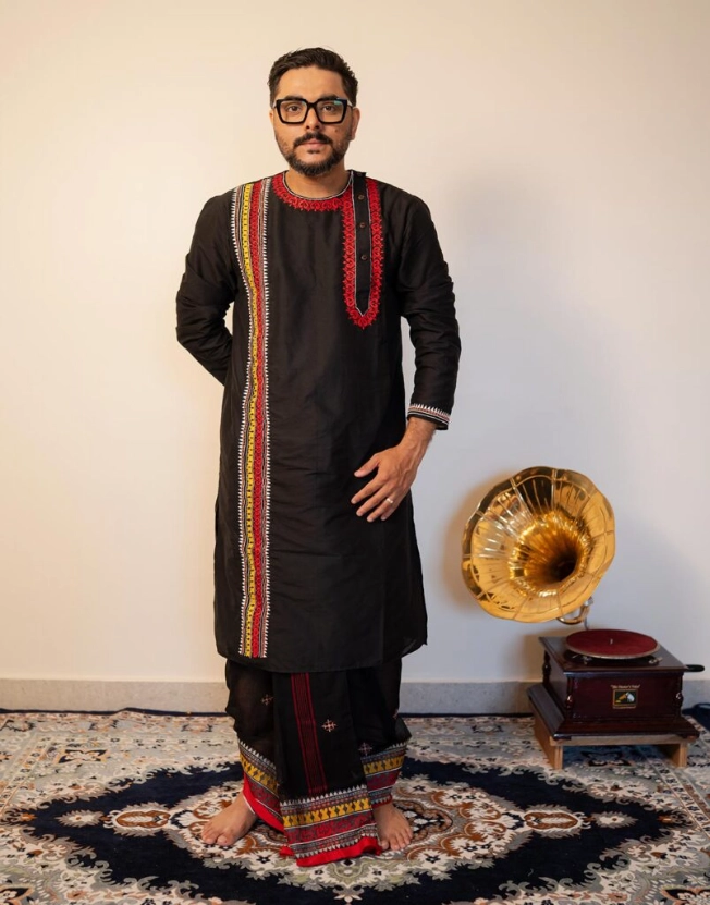 Model is wearing M size Timir Punjabi & Timir dhuti.
